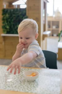 - Cutting fruit and veggies (give them a plastic knife)